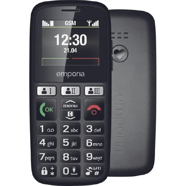 The Emporia Happy is a robust mobile phone designed for seniors, featuring a bright color display, large illuminated buttons, and high-volume sound. It includes 3 quick-call buttons for easy dialing, Bluetooth connectivity, and comes with a convenient charging station for effortless use.