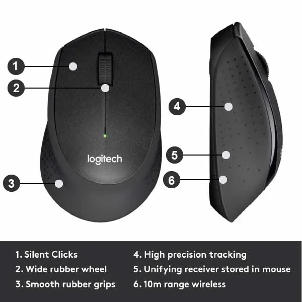 The Logitech M330 SILENT PLUS is a wireless mouse designed for quiet and comfortable use. It features advanced optical tracking for precise cursor control and a contoured shape with soft rubber grips for ergonomic comfort. With a long-lasting battery life of up to 24 months, it offers reliable performance for extended periods. The mouse connects via a USB receiver and is compatible with Windows, macOS, Chrome OS, and Linux systems.