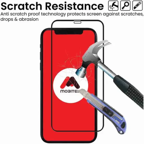 Mobitel's full-coverage tempered glass screen protector utilizes a multi-layer construction for enhanced protection. Each layer plays a specific role, from absorbing impact and resisting scratches to maintaining a clear, responsive touch experience. Enjoy the peace of mind that comes with a screen protector built to safeguard your phone from everyday hazards.
