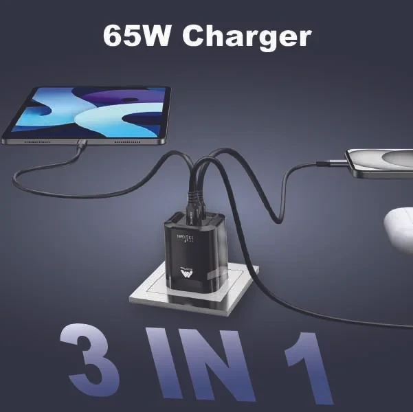 Box Included | 1 x Mobitel 65W 3-in-1 Fast Charger, 1 x 60W Fast USB C-to-C Cable |