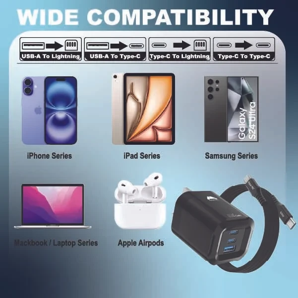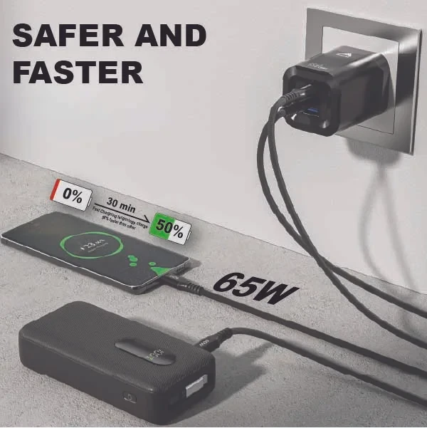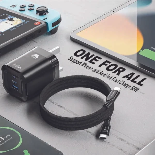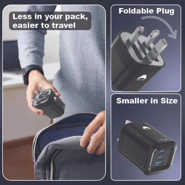 Features | Foldable, 3-Ports, 65W Fast Charging, Portable, Easy to Carry, Free 60W USB-C Cable |