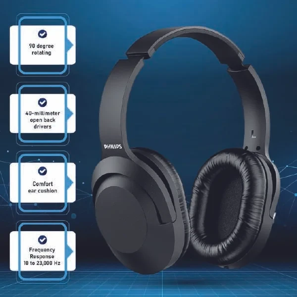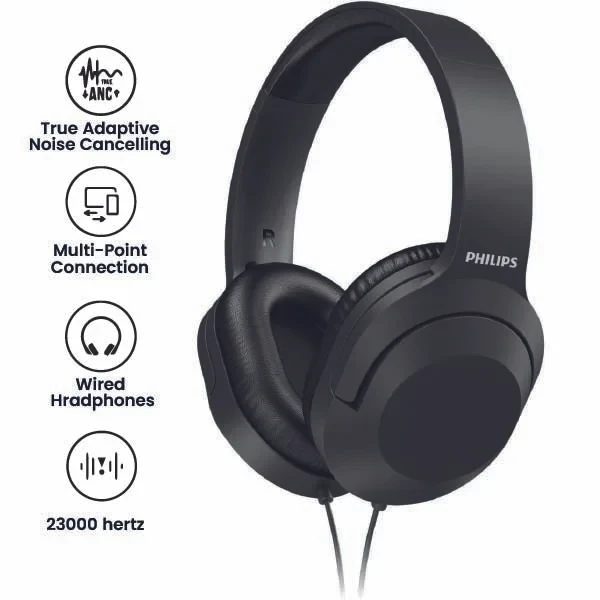 PHILIPS Audio H2005BK/00 Over-Ear Stereo Headphones Wired (2 m Cable, 40 mm Neodymium Drivers, Passive Noise Isolation, Adjustable Headband, Lightweight) Black