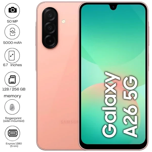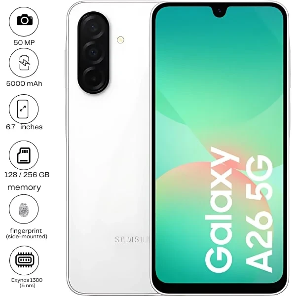 The Samsung Galaxy A26 5G features a large 6.7" Super AMOLED display for a vibrant viewing experience. Powered by an Exynos 1380 chipset, it delivers smooth performance with 5G connectivity. Capture stunning photos with its 50MP main camera. It packs a long-lasting 5000mAh battery and supports 25W fast charging. Stylish, powerful, and perfect for everyday use.
