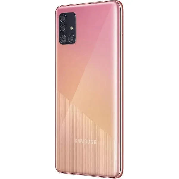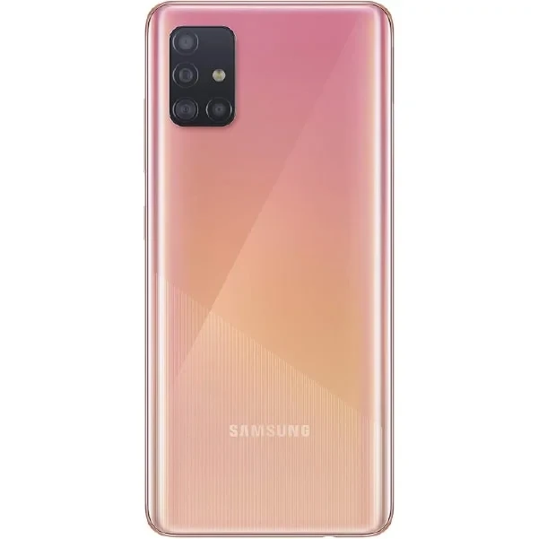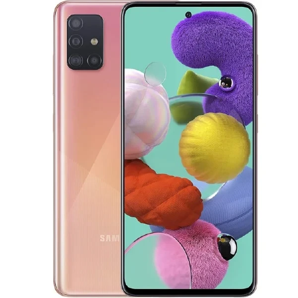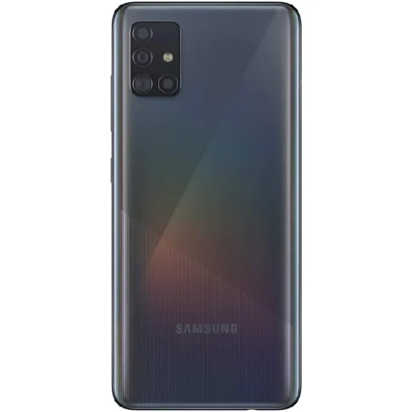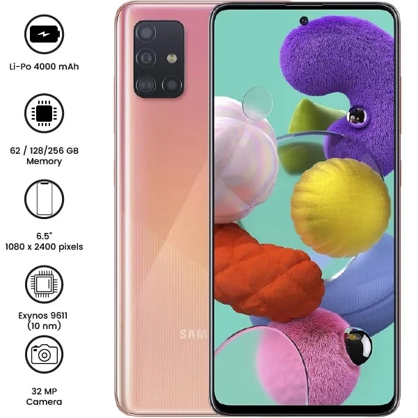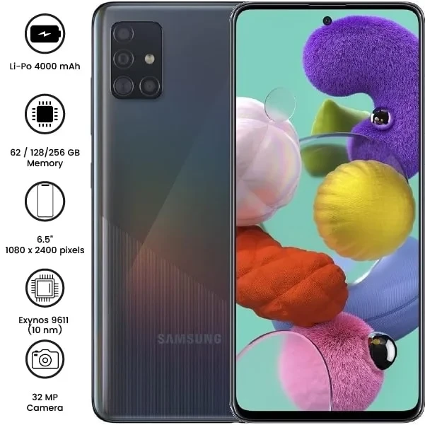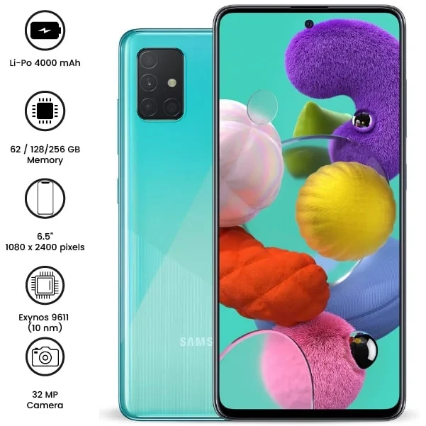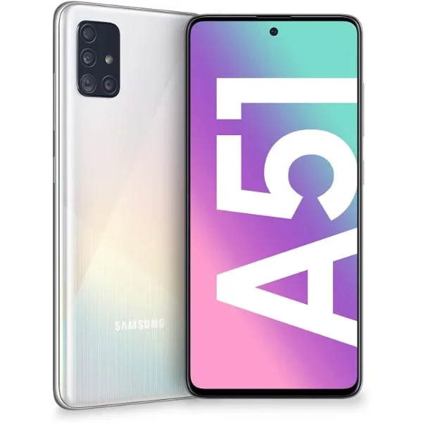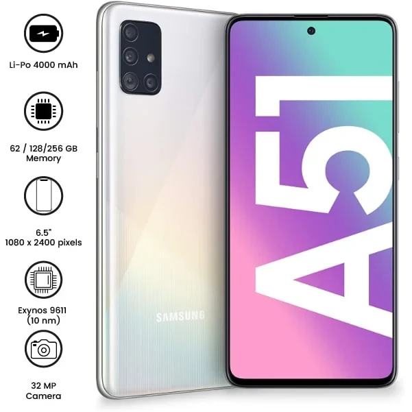 Samsung Galaxy A51 features a 6.5" Super AMOLED display, a quad-camera setup (48MP main), an Exynos 9611 processor, and a 4000mAh battery with 15W fast charging. Sleek design with an in-display fingerprint sensor.
