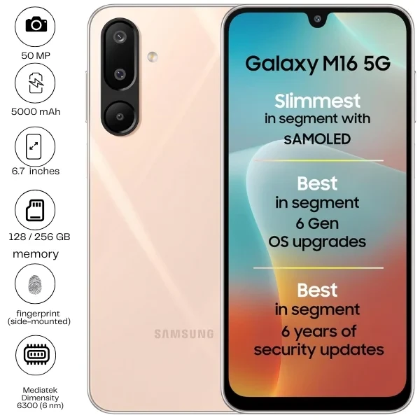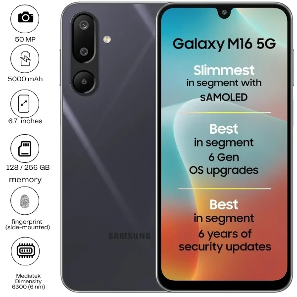 The Samsung Galaxy M16 5G features a 6.7" Super AMOLED display, a 50MP triple rear camera setup, and a powerful 5000mAh battery with 25W fast charging. It runs on the MediaTek Dimensity 6300 processor with Android 15 and One UI 7. With 5G support and a sleek design, it's a solid choice for budget-conscious users.
