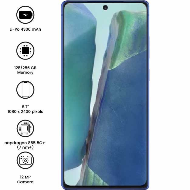 The Samsung Galaxy Note20 5G features a 6.7-inch Super AMOLED+ display, Snapdragon 865+ processor, and S Pen support for enhanced productivity. It has a triple-camera setup (64MP main) and a 4,300mAh battery with fast charging. The device supports 5G connectivity for ultra-fast performance.