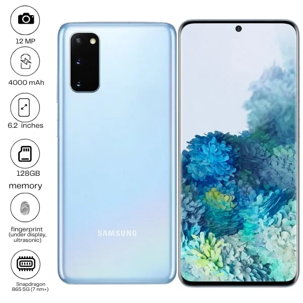 The Samsung Galaxy S20 5G features a 6.2-inch 1440x3200 pixel display for immersive visuals and a powerful 64MP camera with 8K video recording. It is equipped with a 4000mAh battery supporting 25W wired and 15W wireless charging. Experience smooth performance with 5G connectivity.