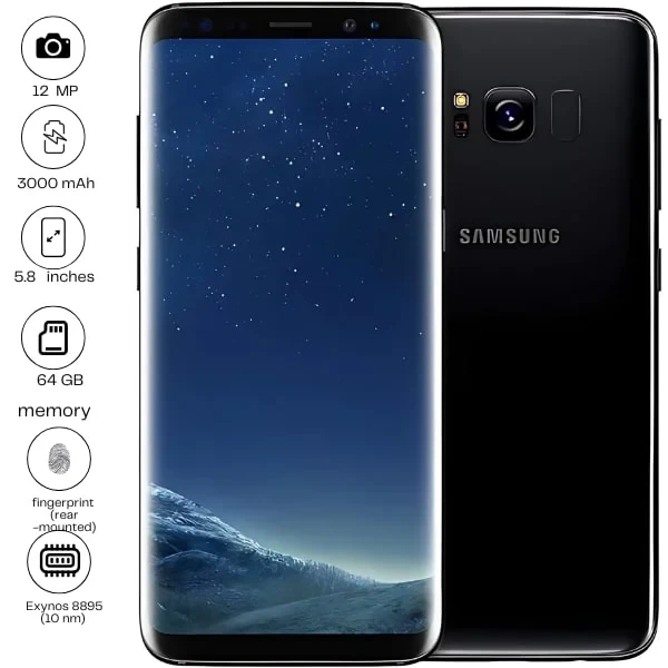 The Samsung Galaxy S8 features a 5.8-inch Quad HD+ Super AMOLED Infinity Display, Exynos 8895 / Snapdragon 835 processor, and Android 7.0 Nougat (upgradable). It has a 12 MP dual-pixel rear camera, 8 MP front camera, and a 3000 mAh battery. The phone supports 4G LTE, Wi-Fi, Bluetooth 5.0, NFC, and IP68 water resistance.